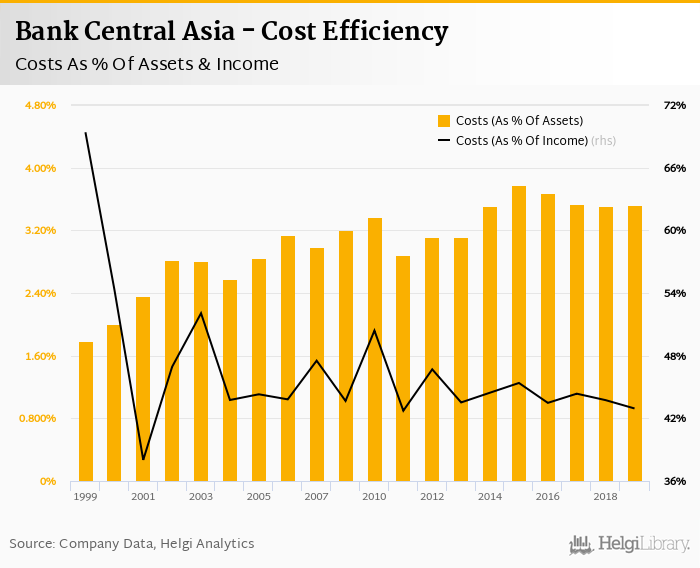 Bank Central Asia's cost to income ratio reached 42.9% in 2019, down from 43.7% compared to the previous year.