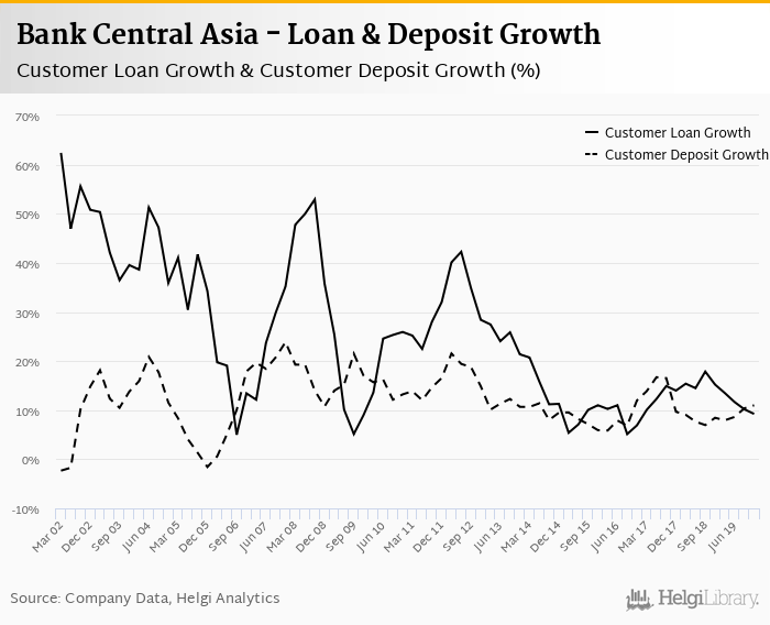 Bank Central Asia's customer loan growth reached 9.23% in 2019-12-31, down from 15.2% compared to the previous year. Historically, the bank’s loans growth reached an all time high of 62.4% in 2002-03-31 and an all time low of 5.00% in 2006-09-30. In the last decade, the average annual loan growth amounted to 17.2%.