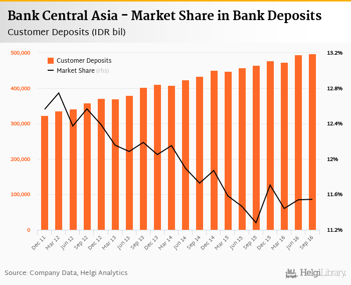 Bank Central Asia accounted for 11.5% of all customer deposits taken by banks in Indonesia at the end of 2016-09-30. Historically, the bank’s market share in customer deposits reached an all time high of 12.7% in 2012-03-31 and an all time low of 11.3% in 2015-09-30.