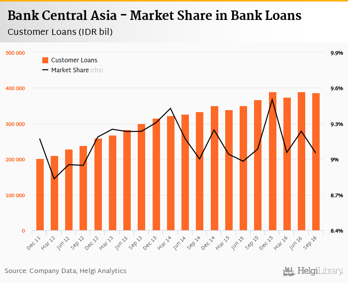 Bank Central Asia's customer loans reached IDR 386,047 bil in 2016-09-30, down 0.692% compared to the previous year.