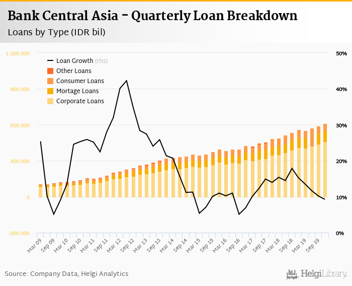 At the end of fourth quarter of 2019, Bank Central Asia's loans accounted for 84.6% of total deposits and 64.9% of total assets.
