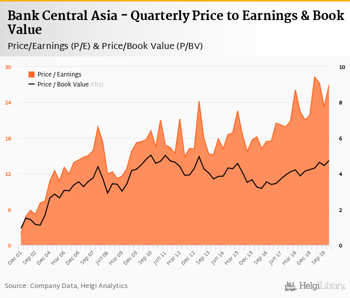 At the end of 4Q2019, the bank traded at price to earnings of 26.9x. Within the last five years, the multiple reached an all time high of 28.2x in 1Q2019 and an all time low of 15.7x in 3Q2015 with an average of 21.1x.