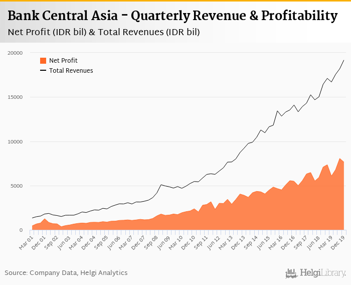 On the other hand, bank’s revenues amounted to an all time high of IDR 19,172 bil in 4Q2019 and an all time low of IDR 1,338 bil in 1Q2001. The average revenues in the last six quarters reached IDR 17,523 bil.