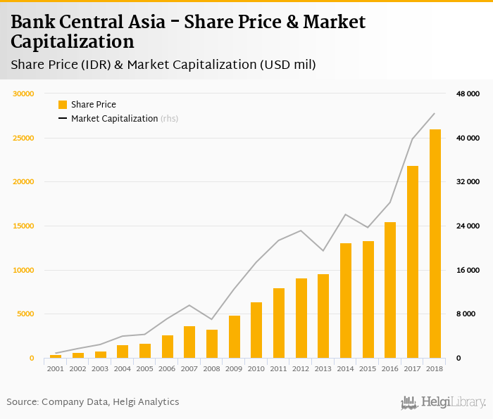 Bank Central Asia stock traded at IDR 26,000 per share at the end of 2018 implying a market capitalization of USD 44,433 mil.