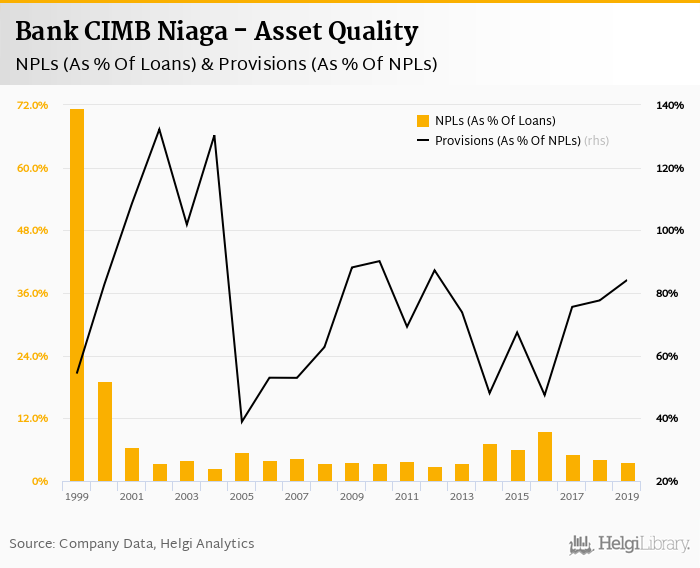 Bank CIMB Niaga's non-performing loans reached 3.71% of total loans at the end of 2019, down from 4.17% compared to the previous year. Historically, the NPL ratio hit an all time high of 71.5% in 1999 and an all time low of 2.56% in 2004.