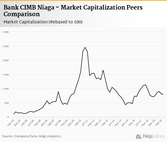 Bank CIMB Niaga stock traded at IDR 965 per share at the end of fourth quarter of 2019 implying a market capitalization of USD 1,737 mil.