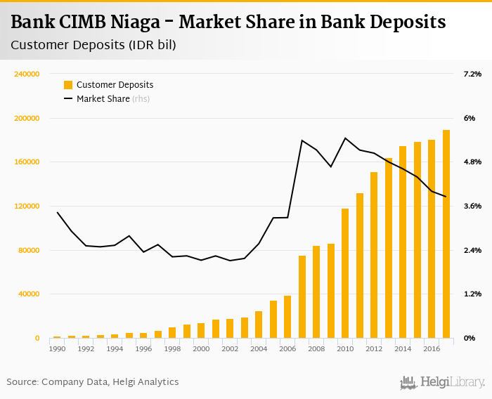 Bank CIMB Niaga accounted for 3.85% of all customer deposits taken by banks in Indonesia at the end of 2017. Historically, the bank’s market share in customer deposits reached an all time high of 5.44% in 2010 and an all time low of 2.11% in 2002.
