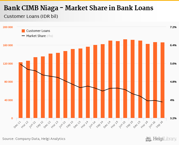 Bank CIMB Niaga's customer loans reached IDR 166,341 bil in 2016-09-30, down 0.432% compared to the previous year.