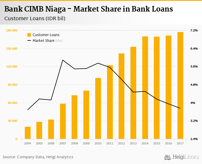 Bank CIMB Niaga accounted for 3.75% of all customer loans issued in Indonesia at the end of 2017. Historically, the bank’s market share in customer loans reached an all time high of 5.88% in 2007 and an all time low of 3.68% in 2004.