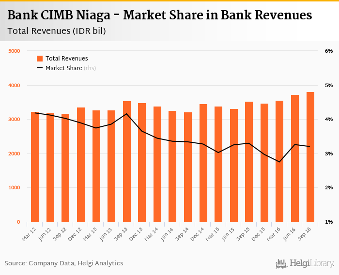 Bank CIMB Niaga generated total banking revenues of IDR 3,817 bil in 2016-09-30, up 2.49% compared to the previous year.