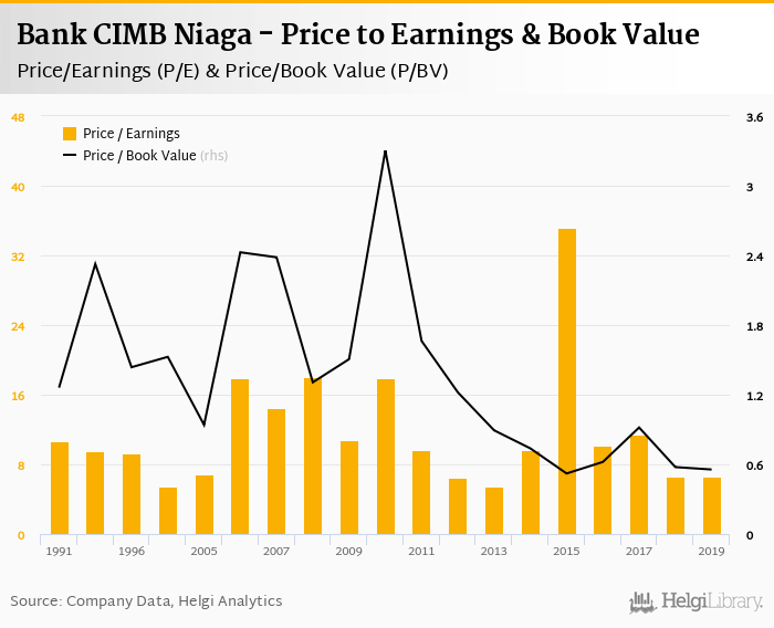 At the end of 2019, the bank traded at price to earnings of 6.60x. Within the last five years, the multiple reached an all time high of 35.2x in 2015 and an all time low of 6.55x in 2018 with an average of 14.0x.
