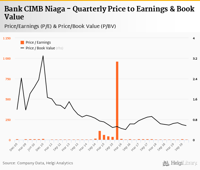 At the end of 4Q2019, the bank traded at price to earnings of 6.22x. Within the last five years, the multiple reached an all time high of 962x in 4Q2015 and an all time low of 6.22x in 4Q2019 with an average of 62.1x.