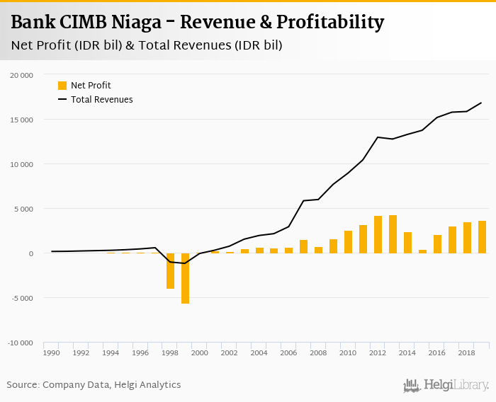 Bank CIMB Niaga made a net profit of IDR 3,644 bil under revenues of IDR 16,826 bil in 2019, up 4.59% and 6.29% respectively compared to the previous year.