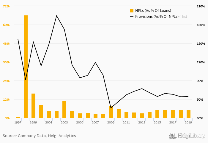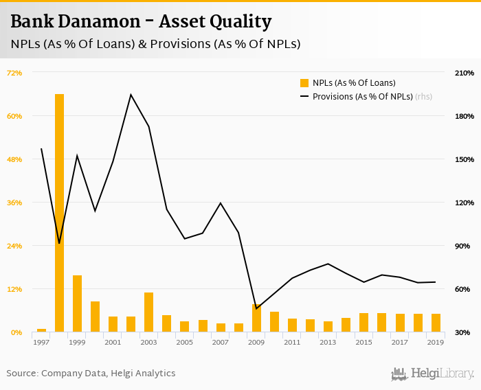 Bank Danamon's non-performing loans reached 5.14% of total loans at the end of 2019, up from 5.07% compared to the previous year. Historically, the NPL ratio hit an all time high of 66.1% in 1998 and an all time low of 1.04% in 1997.