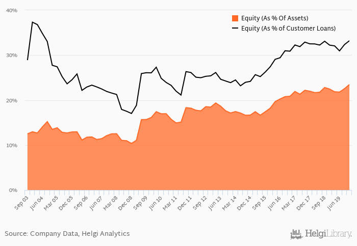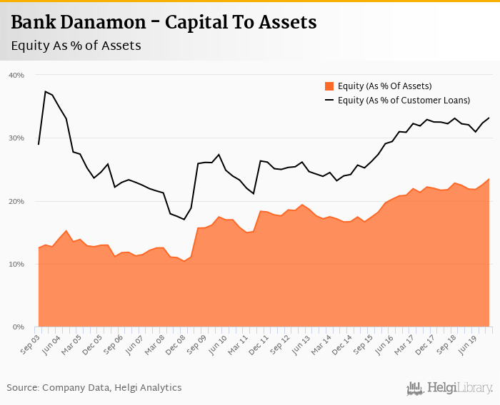 Bank Danamon's Equity reached 23.5% of total assets in the 4Q2019, up from 22.5% for the previous year. As a share of net customer loans, the ratio amounted to 33.2% at the end of the fourth quarter of 2019.