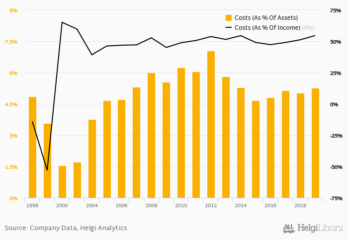 Historically, the bank’s costs reached an all time high of 65.1% of income in 2000 and an all time low of -53.0% in 1999.