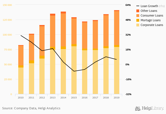 Mortgage loans represented 2.01% of the bank's loan book at the end of the year 2019, consumer further 40.6% and corporate loans 56.2% of total loans.