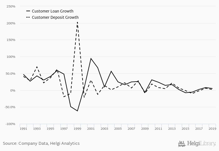 On the other hand, bank's customer deposit growth amounted to 1.95% at the end of 2019, down from 5.69% when compared to the previous year. Historically, the bank’s deposit growth reached an all time high of 203% in 1999 and an all time low of -21.3% in 2000. In the last decade, the average annual loan growth amounted to 5.03%.