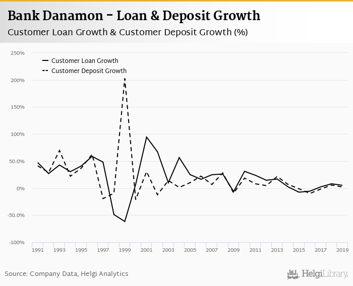 Bank Danamon's customer loan growth reached 5.09% in 2019, down from 8.02% compared to the previous year. Historically, the bank’s loans growth reached an all time high of 94.4% in 2001 and an all time low of -61.7% in 1999. In the last decade, the average annual loan growth amounted to 8.41%.