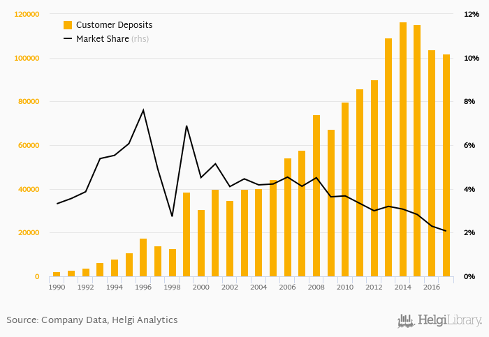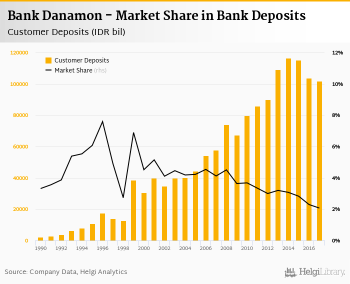 Bank Danamon accounted for 2.07% of all customer deposits taken by banks in Indonesia at the end of 2017. Historically, the bank’s market share in customer deposits reached an all time high of 7.59% in 1996 and an all time low of 2.07% in 2017.