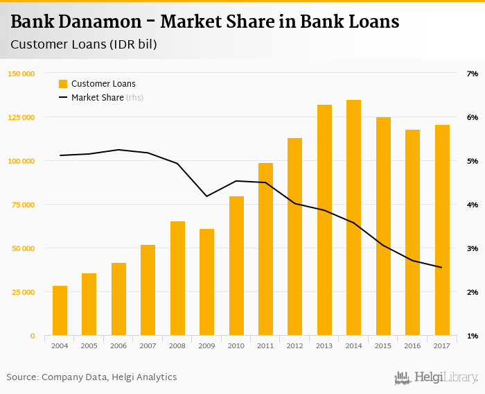 Bank Danamon accounted for 2.54% of all customer loans issued in Indonesia at the end of 2017. Historically, the bank’s market share in customer loans reached an all time high of 5.24% in 2006 and an all time low of 2.54% in 2017.