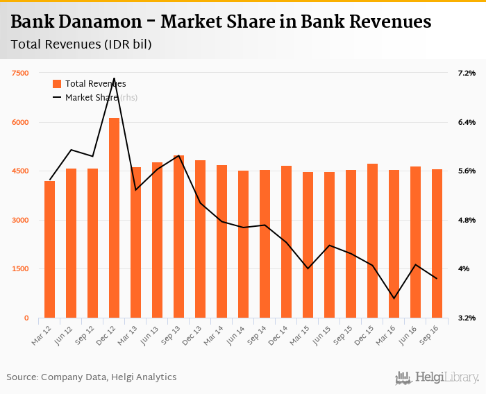 Bank Danamon generated total banking revenues of IDR 4,574 bil in 2016-09-30, down 1.60% compared to the previous year.