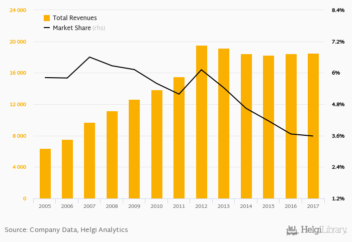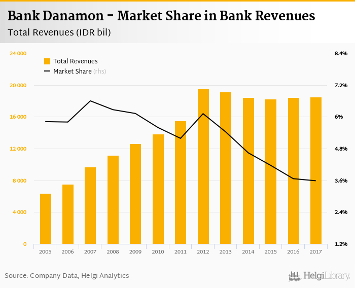 As a result, Bank Danamon accounted for 3.58% of all bank revenues generated by banks in Indonesia in 2017. Historically, the bank’s market share in total revenues reached an all time high of 6.60% in 2007 and an all time low of 3.58% in 2017.