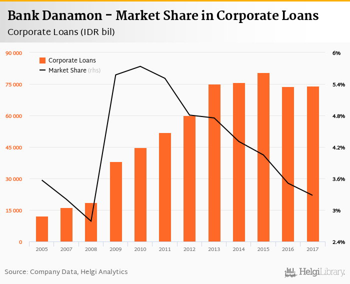 Bank Danamon accounted for 3.28% of all corporate loans issued in Indonesia at the end of 2017. Historically, the bank’s market share in corporate loans reached an all time high of 5.74% in 2010 and an all time low of 2.79% in 2008.
