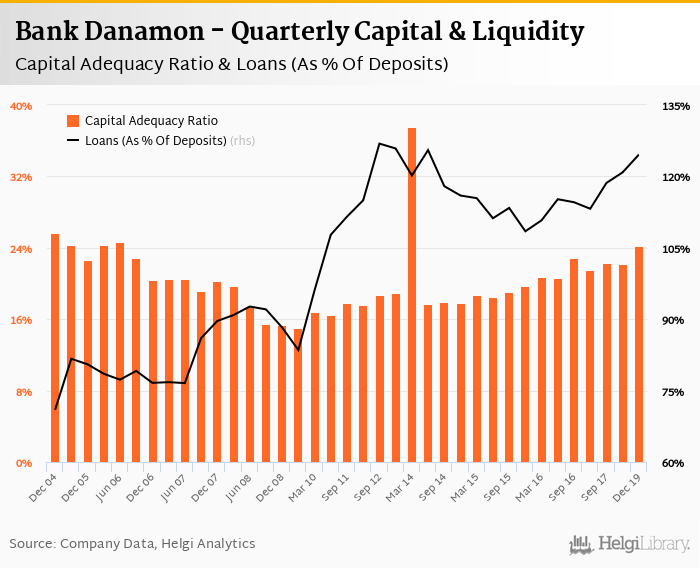 Bank Danamon's capital adequacy ratio reached 24.2% at the end of fourth quarter of 2019, up from when compared to the previous quarter. Historically, the bank’s capital ratio hit an all time high of 37.5% in 1Q2014 and an all time low of 15.0% in 1Q2009.