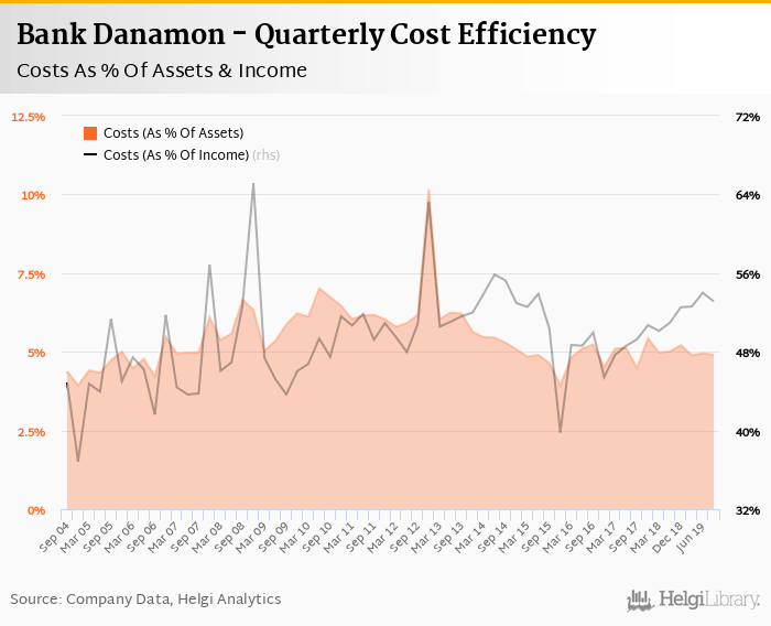 Bank Danamon's cost to income ratio reached 53.1% in the third quarter of 2019, down from 54.0% when compared to the previous quarter.