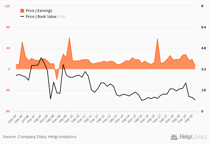 In terms of price to book value, the stock reached 0.850x at the end of 4Q2019. Since the fourth quarter of 2014, the multiple reached an all time high of 2.15x in 1Q2019 and an all time low of 0.818x in 3Q2015 with an average of 1.29x.