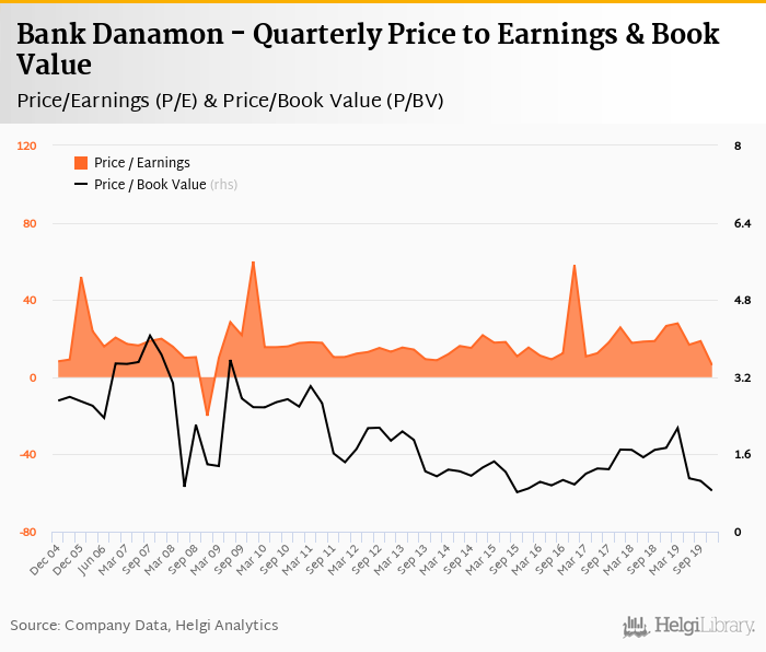 At the end of 4Q2019, the bank traded at price to earnings of 6.20x. Within the last five years, the multiple reached an all time high of 58.0x in 4Q2016 and an all time low of 6.20x in 4Q2019 with an average of 18.6x.