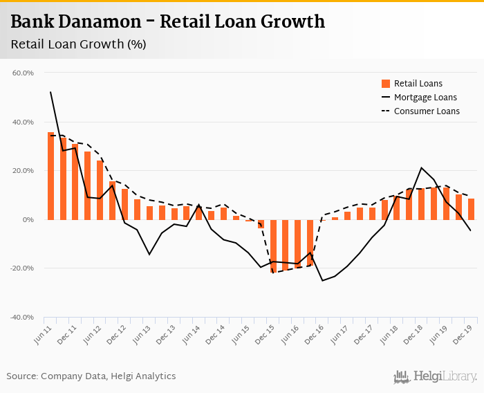 Bank Danamon's retail loans reached IDR 60,223 bil at the end of 2019-12-31, up 1.59% compared to the previous year. In the last decade, the average annual loan growth amounted to 0%.