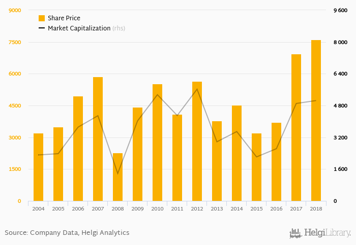 Since the end of 2013, the stock has appreciated by 101 % implying an annual average growth of 15.0 %. In absolute terms, the value of the company rose by USD 2,076 mil.