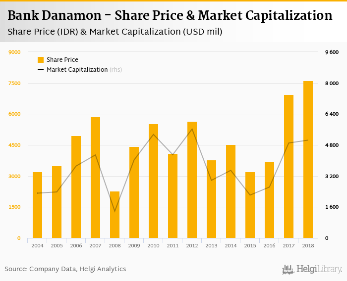 Bank Danamon stock traded at IDR 7,600 per share at the end of 2018 implying a market capitalization of USD 5,049 mil.