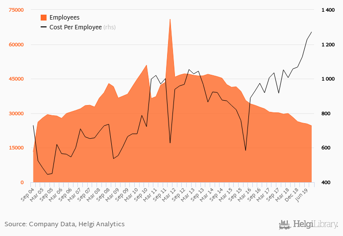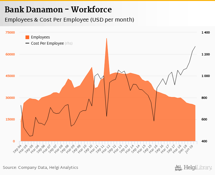 Bank Danamon employed 24,541 persons in 2019-09-30, down 3.42% when compared to the previous year. Historically, the bank's workforce hit an all time high of 70,949 persons in 2011-12-31 and an all time low of 13,260 in 2004-09-30.