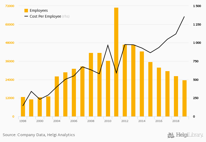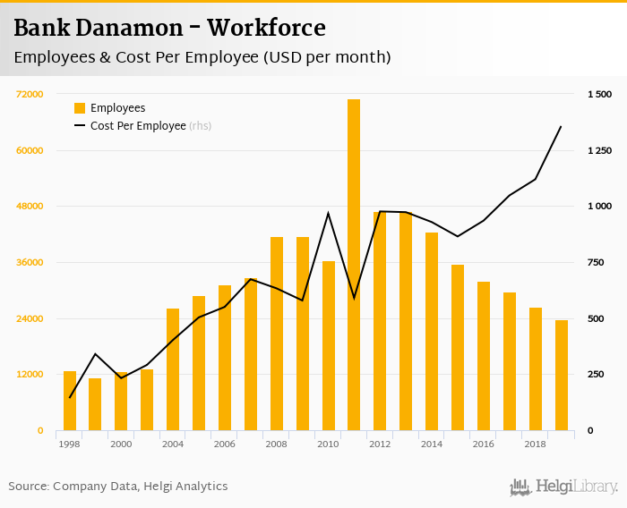 Bank Danamon employed 23,825 persons in 2019, down 9.72% when compared to the previous year. Historically, the bank's workforce hit an all time high of 70,949 persons in 2011 and an all time low of 11,282 in 1999.