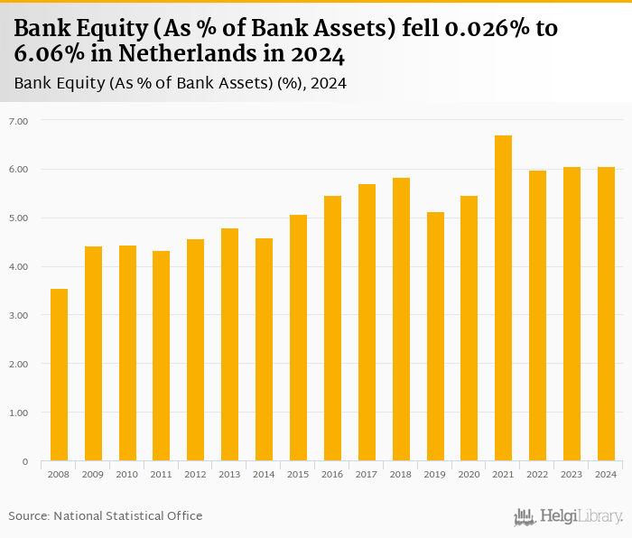 Bank equity as a share of bank assets fell 0.026% to 6.06% in Netherlands in 2024, according to the National Central Bank.