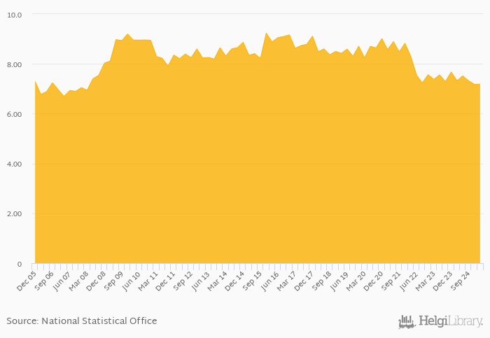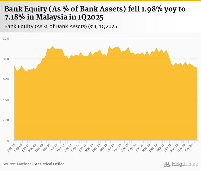 Bank equity as a share of bank assets fell 1.98% yoy to 7.18% in Malaysia in 1Q2025, according to the National Central Bank. This is 0.066% more than in the previous quarter.