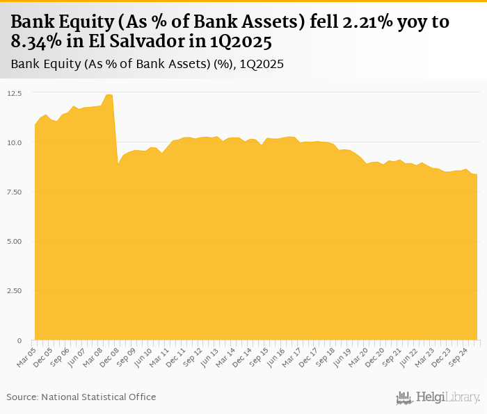 Bank equity as a share of bank assets fell 2.21% yoy to 8.34% in El Salvador in 1Q2025, according to the National Central Bank. This is 0.433% less than in the previous quarter.