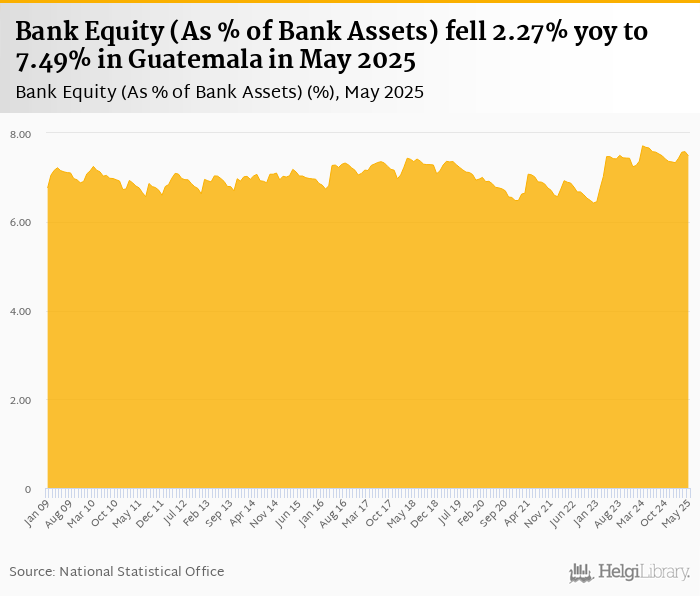 Bank equity as a share of bank assets fell 2.27% yoy to 7.49% in Guatemala in May 2025, according to the National Central Bank. This is 1.22% less than in the previous month.