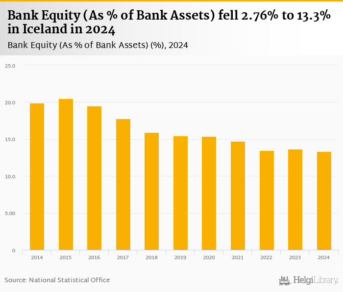 Bank equity as a share of bank assets fell 2.76% to 13.3% in Iceland in 2024, according to the National Central Bank.