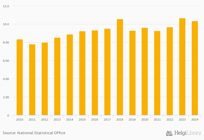 Historically, bank equity as a share of bank assets in Namibia reached an all time high of 10.7% in 2023 and an all time low of 7.79% in 2011.