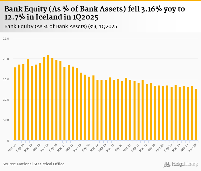 Bank equity as a share of bank assets fell 3.16% yoy to 12.7% in Iceland in 1Q2025, according to the National Central Bank. This is 4.28% less than in the previous quarter.