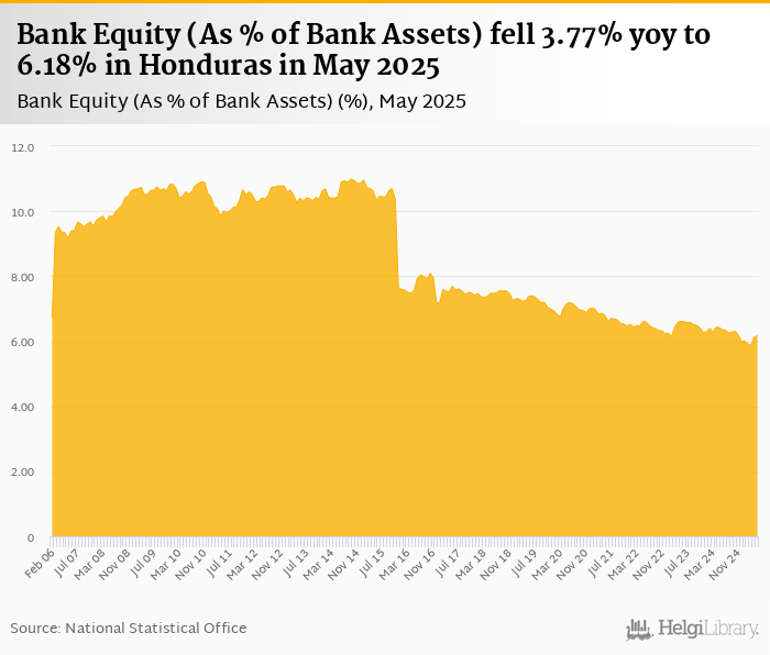 Bank equity as a share of bank assets fell 3.77% yoy to 6.18% in Honduras in May 2025, according to the National Central Bank. This is 0.824% more than in the previous month.