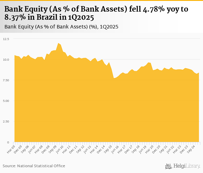 Bank equity as a share of bank assets fell 4.78% yoy to 8.37% in Brazil in 1Q2025, according to the National Central Bank. This is 1.83% more than in the previous quarter.