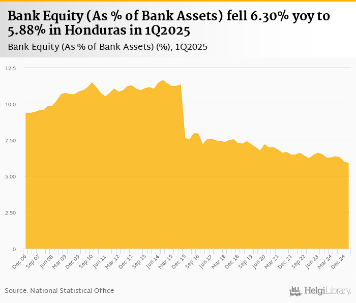 Bank equity as a share of bank assets fell 6.30% yoy to 5.88% in Honduras in 1Q2025, according to the National Central Bank. This is 1.89% less than in the previous quarter.