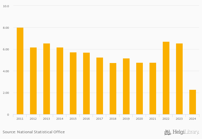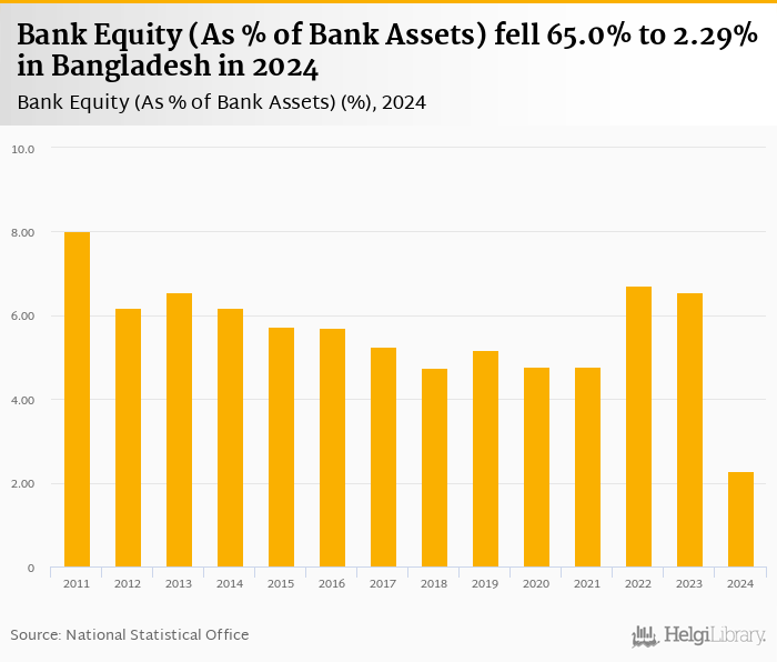 Bank equity as a share of bank assets fell 65.0% to 2.29% in Bangladesh in 2024, according to the National Central Bank.