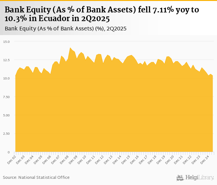 Bank equity as a share of bank assets fell 7.11% yoy to 10.3% in Ecuador in 2Q2025, according to the National Central Bank. This is 2.14% less than in the previous quarter.