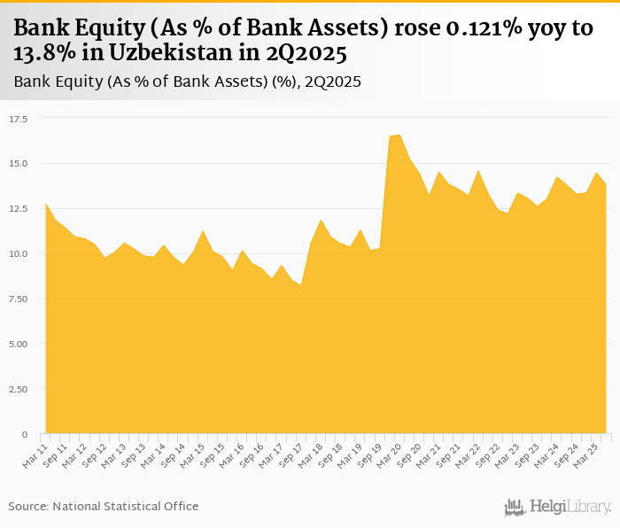 Bank equity as a share of bank assets rose 0.121% yoy to 13.8% in Uzbekistan in 2Q2025, according to the National Central Bank. This is 4.63% less than in the previous quarter.